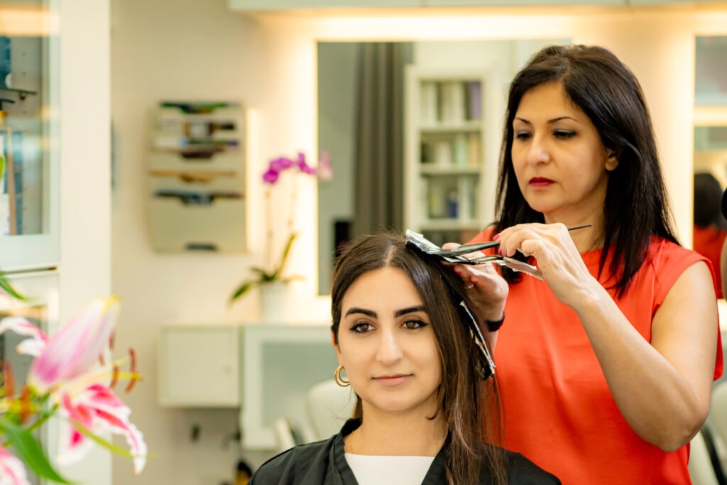 Once the hair is dry, the Stylist will divide the hair into four sections and begin using a flat iron to further straighten the hair in 2-3 inch sections.